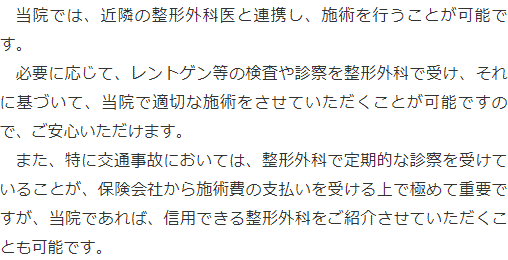 整骨院に通院する際には、「どのような整骨院がよいのだろう?」と迷うこともあるかと思います。こちらに選ぶ際のポイントを掲載しておりますのでご参照ください。