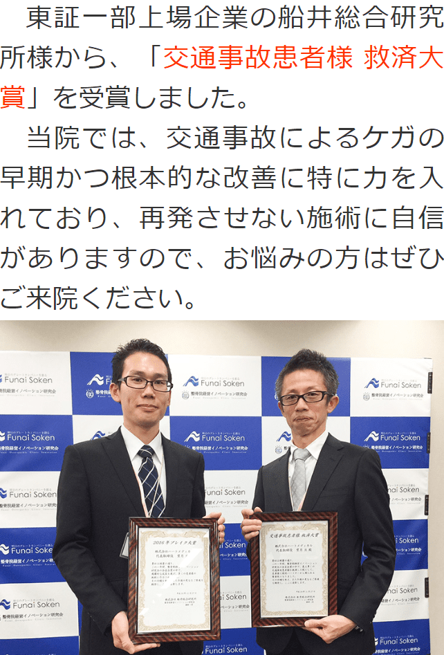 当院では、自動車事故に遭われた方への施術に力を入れており、上記のような賞を受賞しています。ケガの改善に向けて施術を行っていきます。