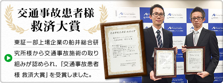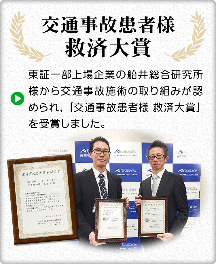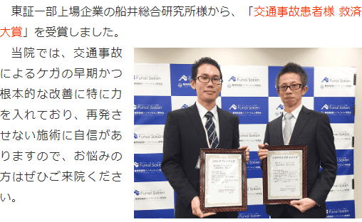 当院では、自動車事故に遭われた方への施術に力を入れており、上記のような賞を受賞しています。ケガの改善に向けて施術を行っていきます。