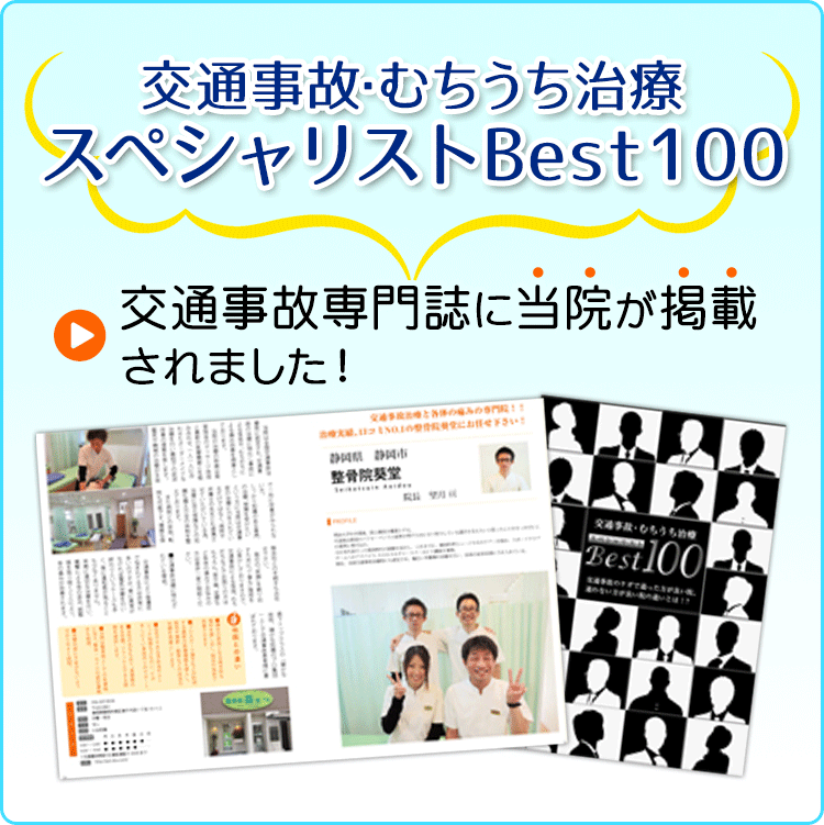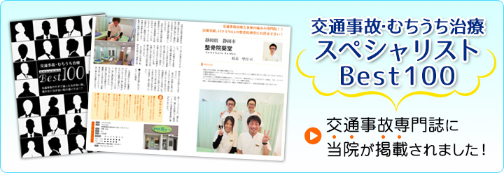 事故で首をケガした方に対する施術も得意としており、上記の専門誌にも掲載されました。頸椎捻挫などでお悩みでしたら当院へお越しください。